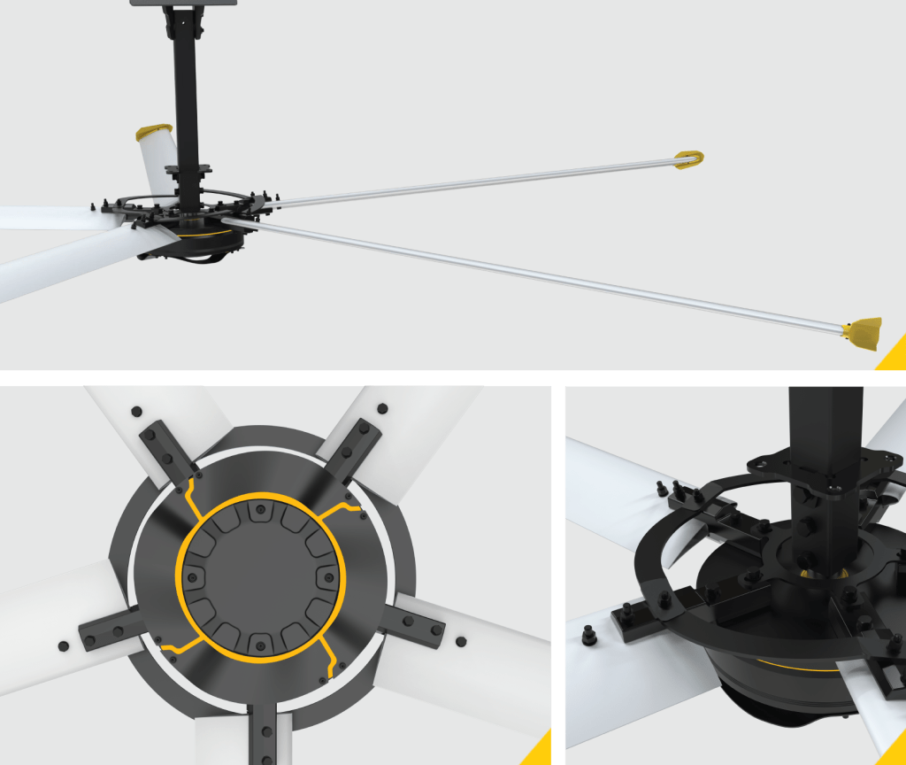 Designed to boost airflow and reduce drag, enhancing efficiency in industrial ceiling fans.